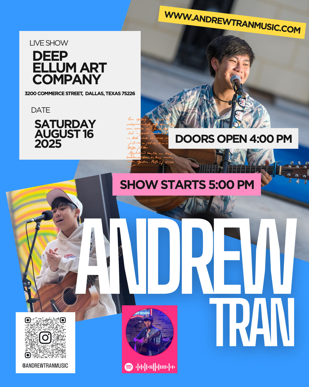 Andrew Tran is Texan born and raised in Austin, Texas. He's been a fan of pop music since he was born and heard his dad singing Danny's Song by Loggins and Messina. Andrew first borrowed a guitar when he was 12 during the pandemic shutdown so he could write a song to apply to an online songwriting workshop for 16 year-olds. in January of 2024, he started covering his favorite pop songs on instagram and released his first song, One on all the streaming platforms. SInce then, Andrew has played his music live all over the world including the UK, Australia and Japan. He's also played across the US from the East Coast to the Pacific Shores. Andrew is always excited to share his songs which he labels as pop, but often blends elements of folk, rock, alternative driven by heartfelt melodies and lyrics. His musical influences are as varied as his taste in cheeses. He loves cheese and he loves music. He's currently in his singer-songwriter era and loves Ed Sheeran, Taylor Swift, Gracie Abrams, Noah Kahan, FInneas and Jack Antonoff. Andrew can't wait to share his music with you!