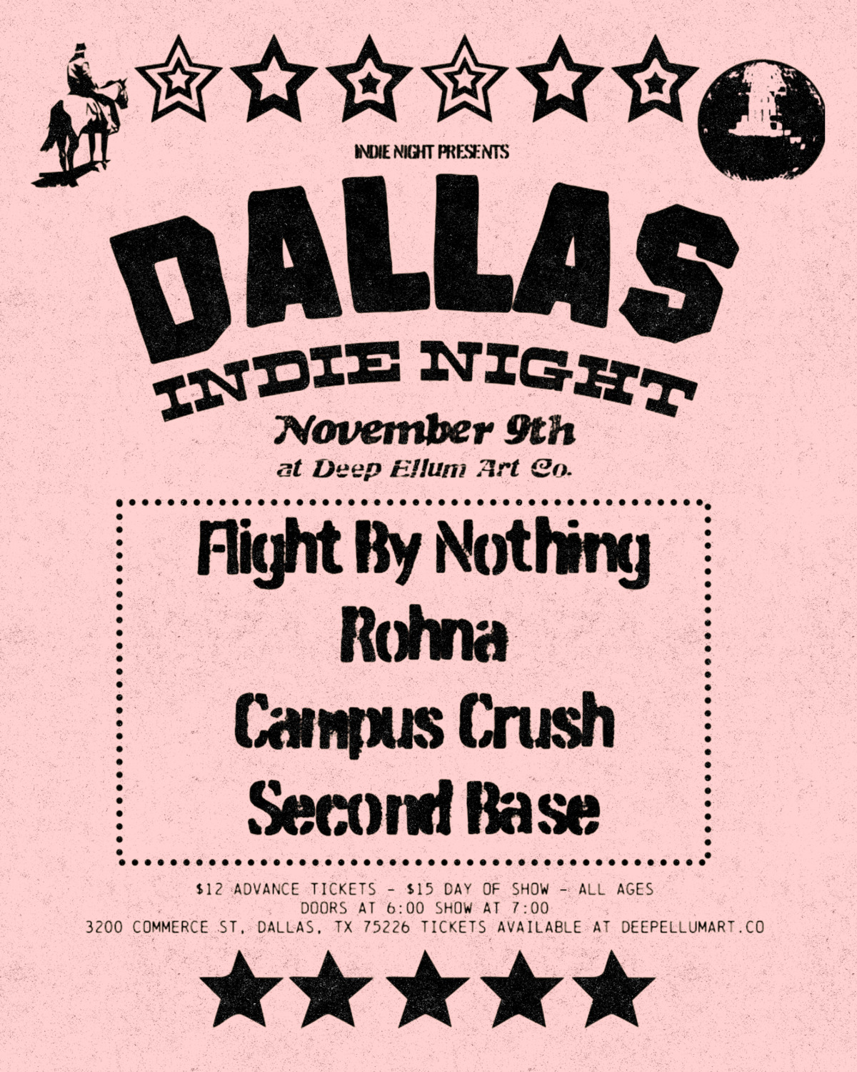 Join us on November 16th at the legendary Deep Ellum Art Co for a stacked lineup featuring local standouts Flight By Nothing, Campus Crush, and Second Base, along with touring guests Rohna from Florida.