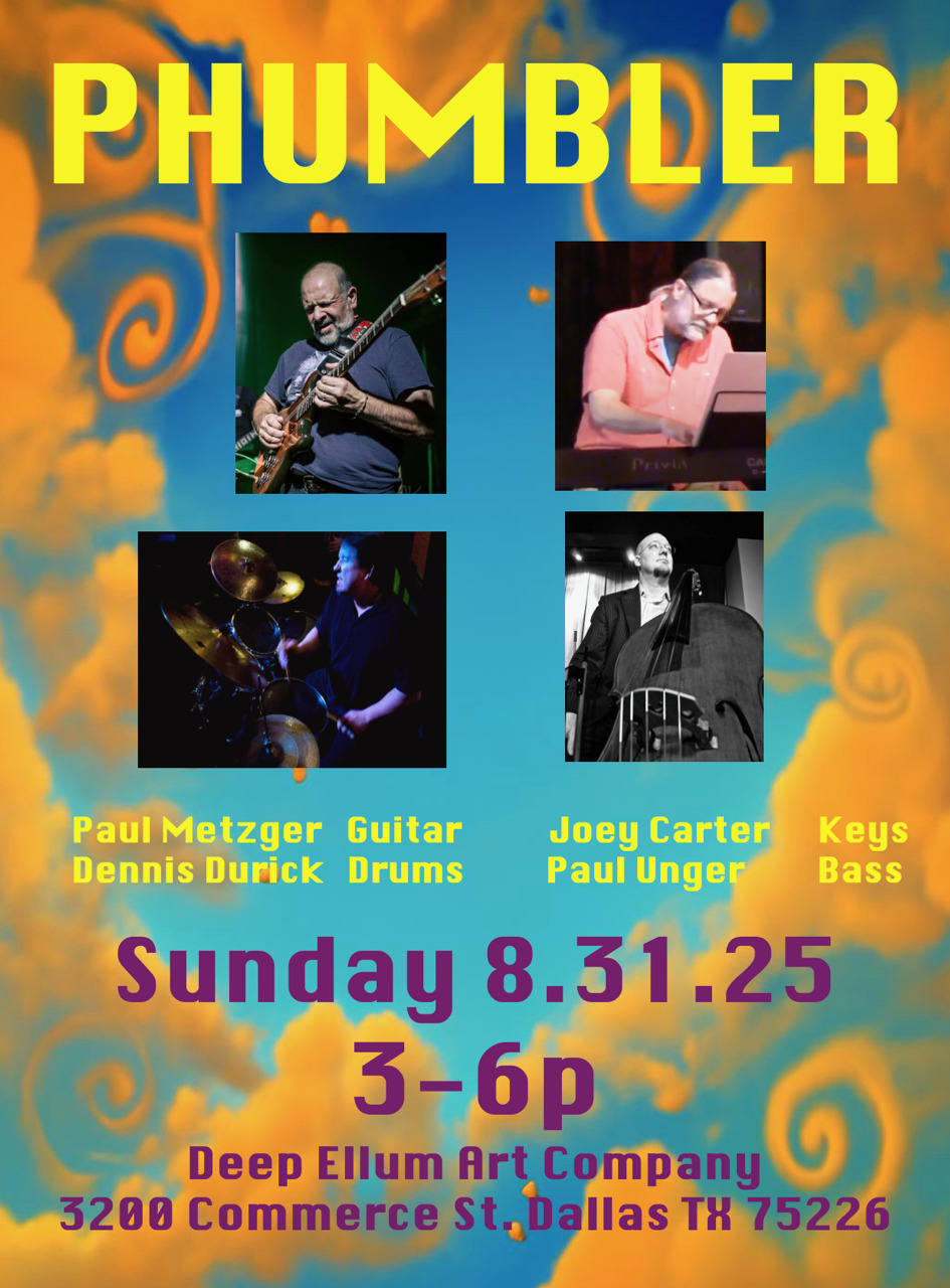 Join us on Sunday, August 31, 2025, from 3–6 PM for an afternoon of groovy jams and good vibes as PHUMBLER takes the stage! This powerhouse jam band blends jazz, funk, and improvisation for a sound that’s sure to get your toes tapping. Featuring Paul Metzger (guitar), Dennis Durick (drums), Joey Carter (keys), and Paul Unger (bass), the music will be as dynamic as the crowd.